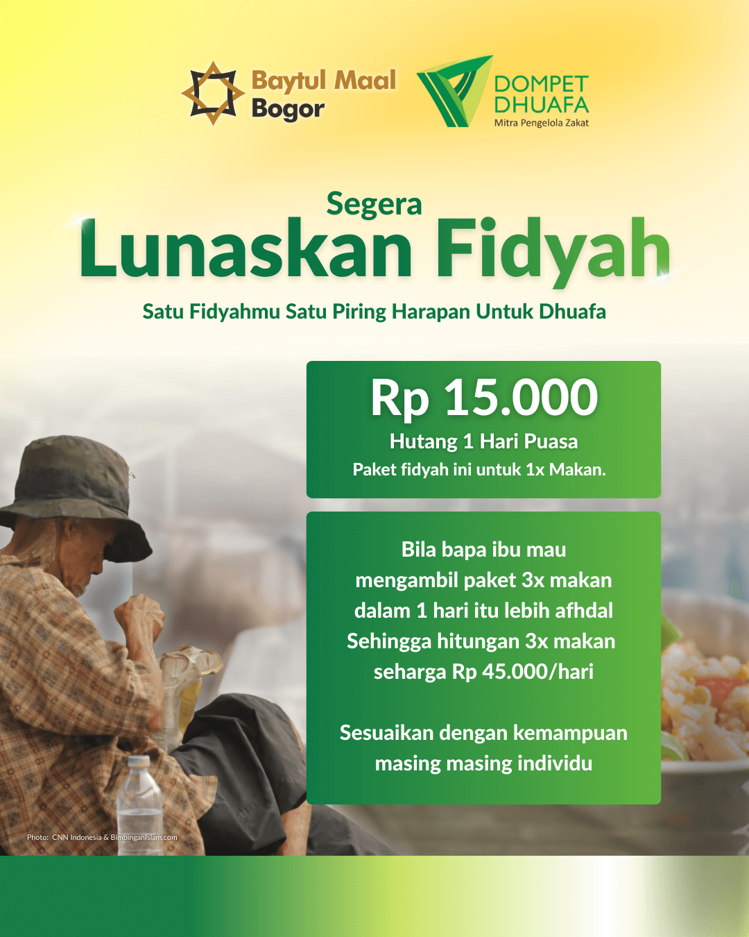 Dengan nilai Rp15.000 per paket per hari puasa, fidyah Anda disalurkan secara amanah, tepat sasaran, dan transparan oleh Baytul Maal Bogor. Karena satu fidyah yang Anda tunaikan hari ini, dapat menjadi satu piring harapan bagi mereka yang membutuhkan.
