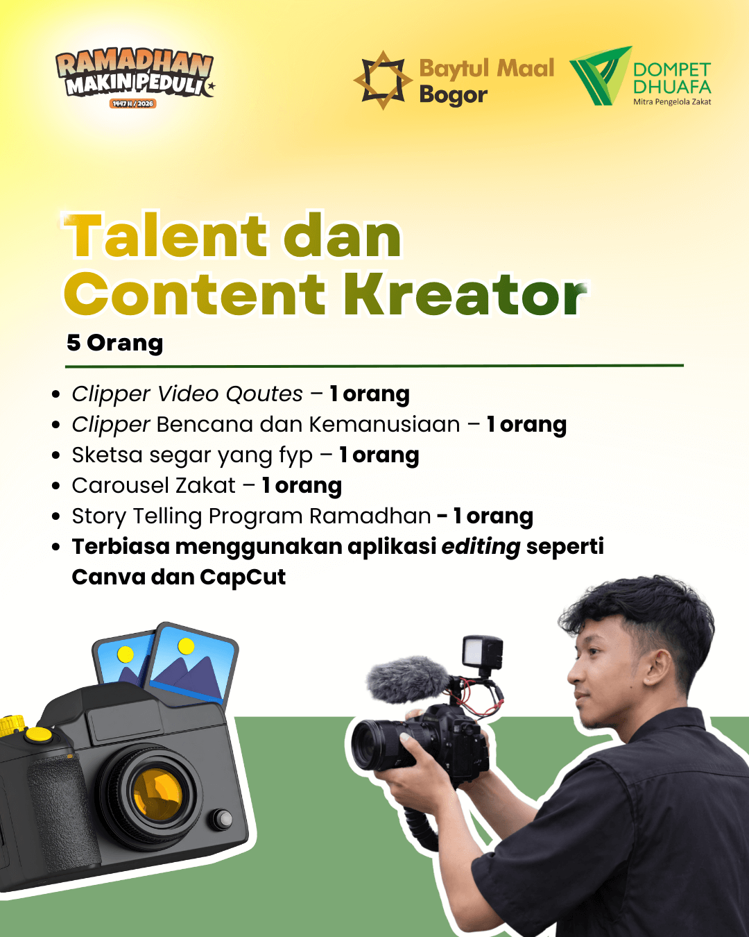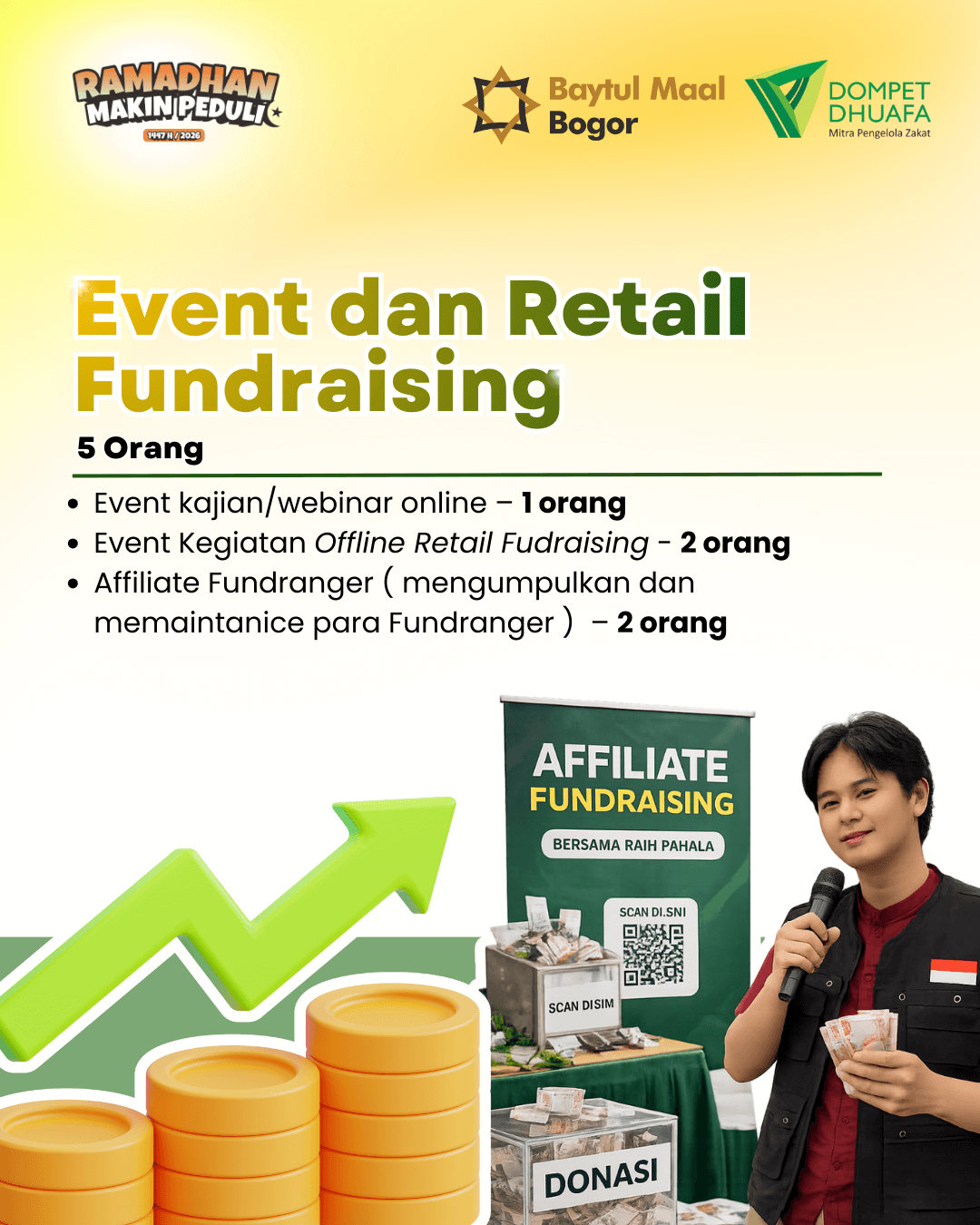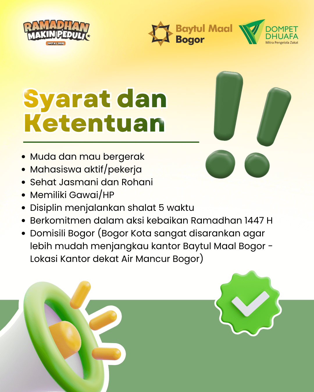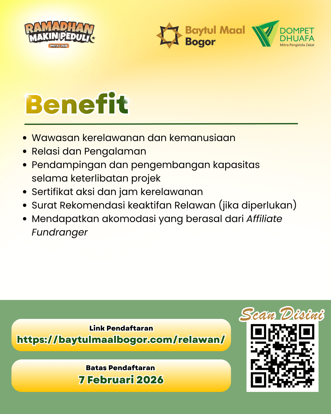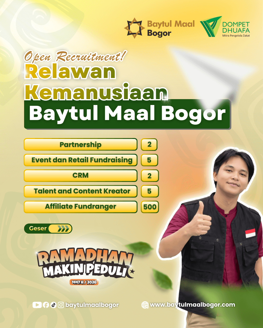 Bergabunglah bersama Baytul Maal Bogor dalam aksi kebaikan Ramadhan 1447 H. Kami membuka kesempatan bagi kamu yang ingin bergerak, bertumbuh, dan berdampak langsung untuk masyarakat.